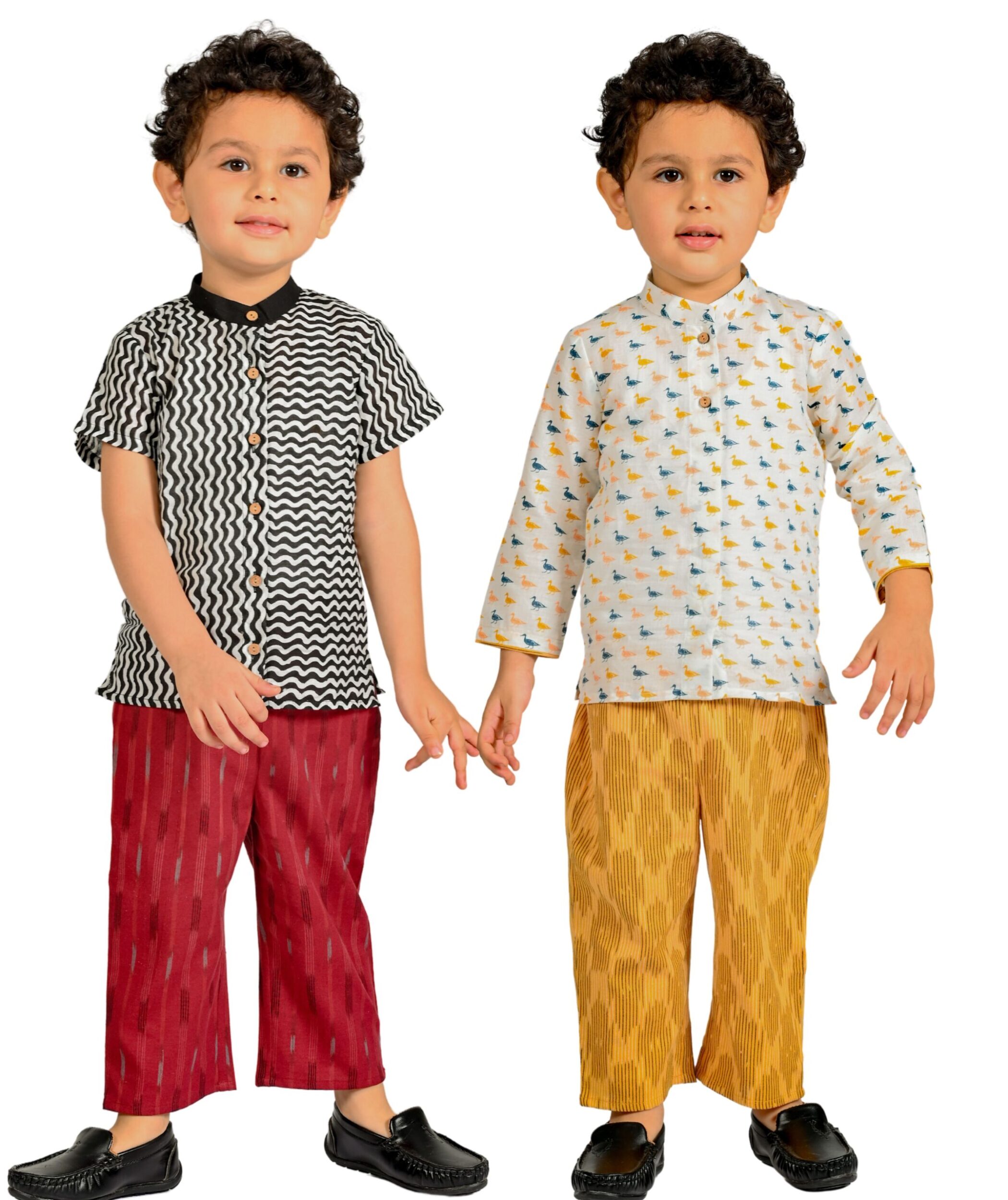 Kids Boys Cotton Shirt With Pant – Yellow:Black & Purple:Black Set