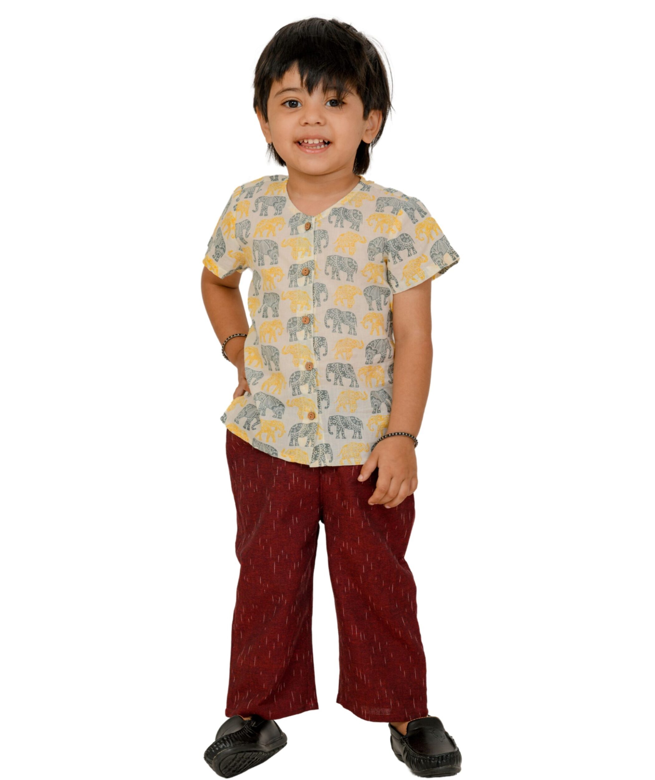 Baby Boys’ Cotton Shirt With Pant – White:Maroon & Beige:Green