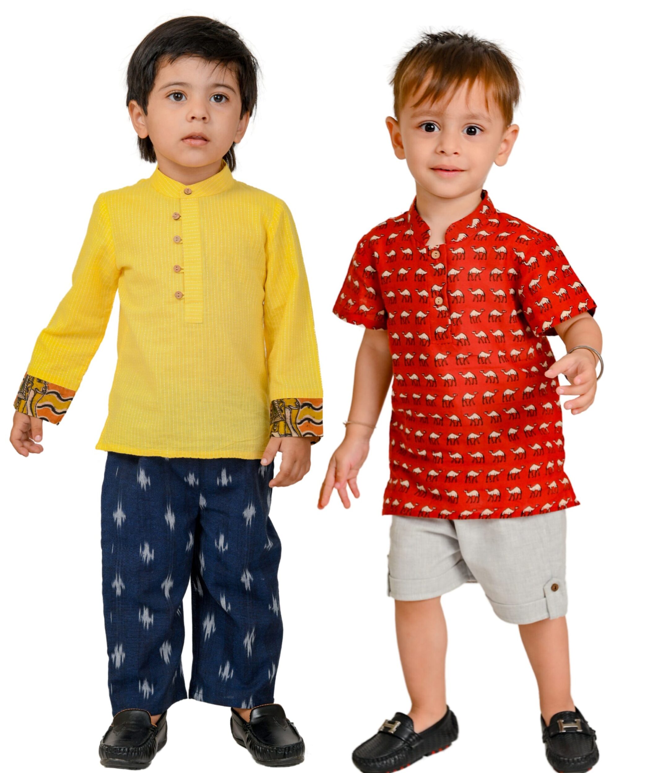 Kids Boys Cotton Shirt Pant Shorts Sets- Yellow:Blue & Red:Grey