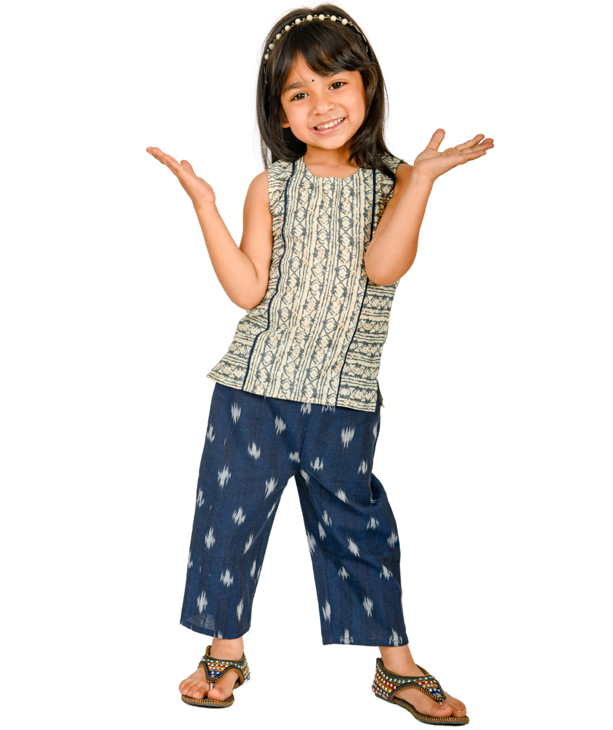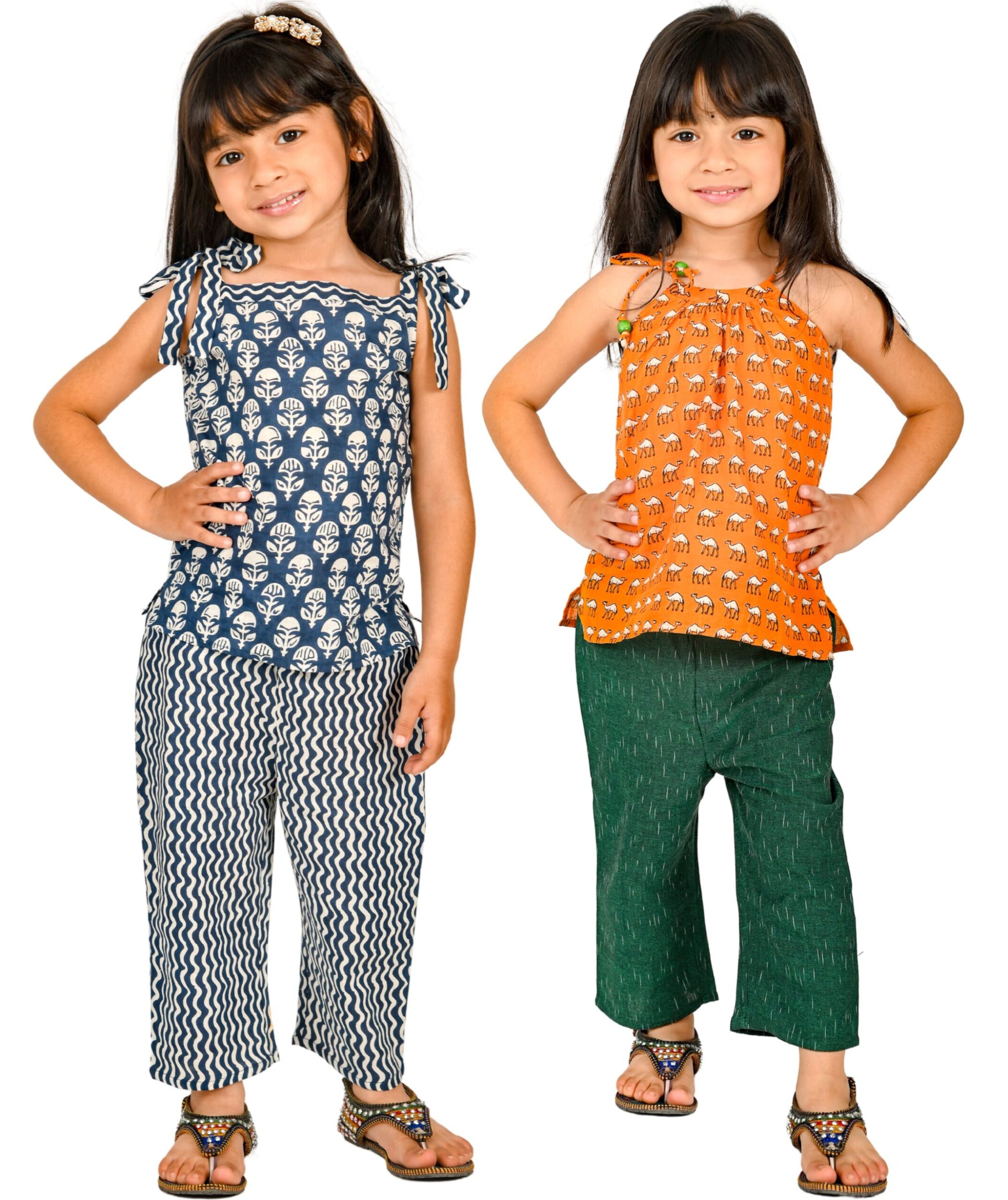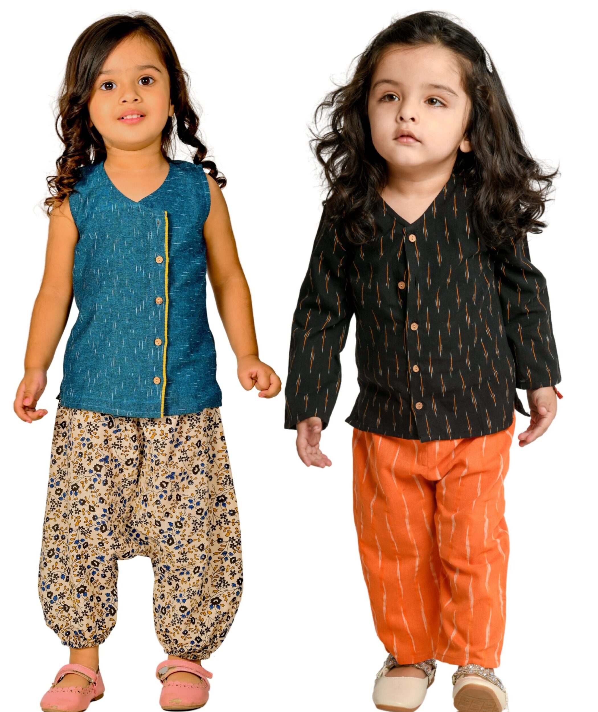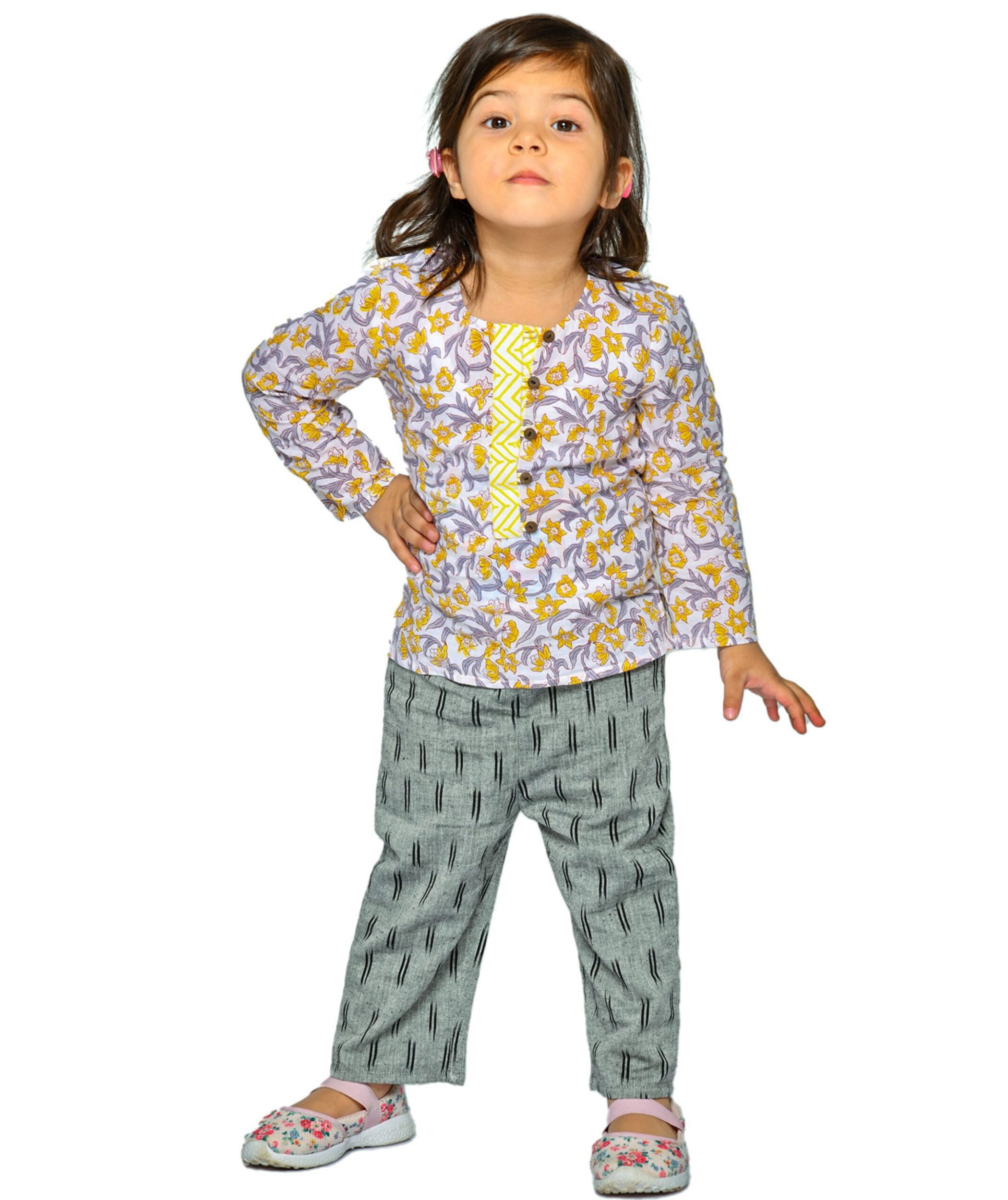 Kids Girls Dress Cotton Top Pant Set – Blue:Beige & Black:Orange