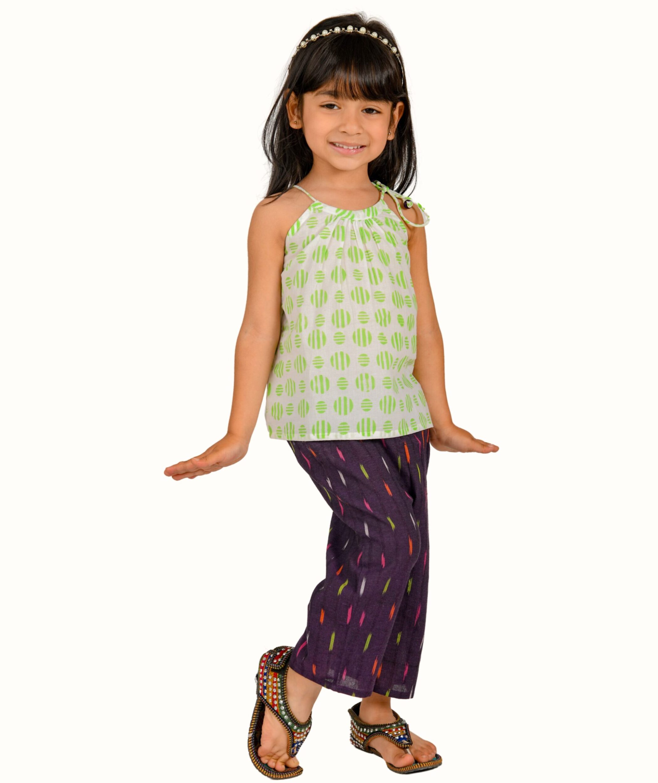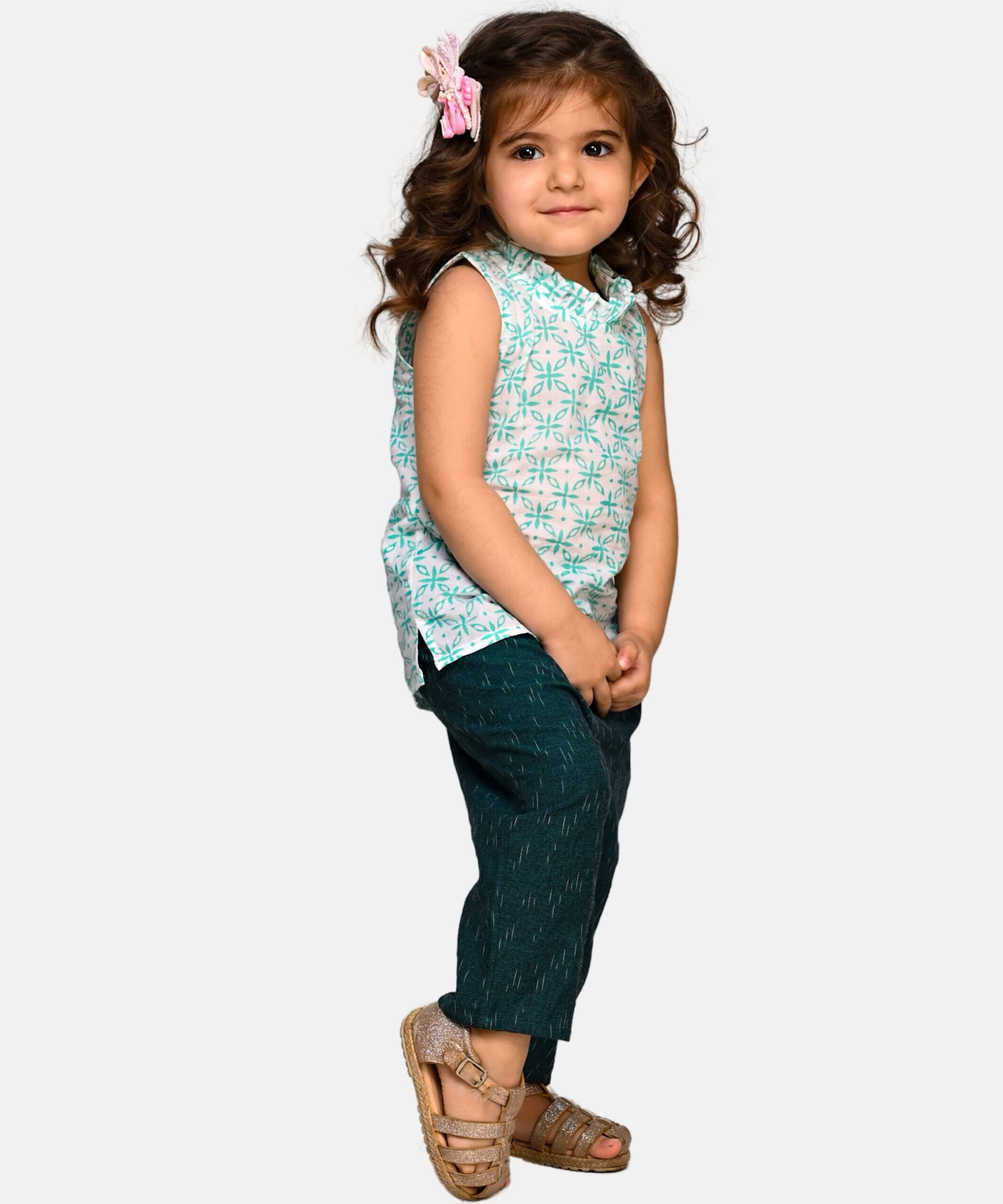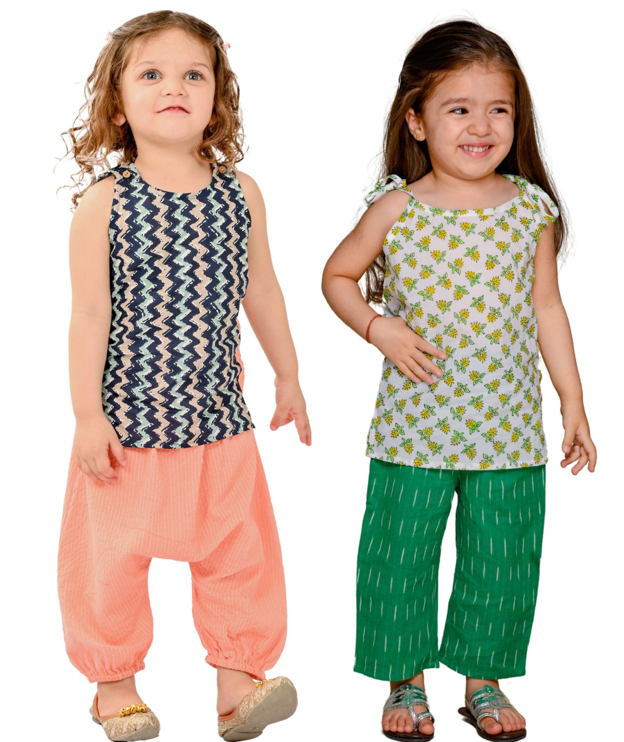 Baby Girls Dress Cotton Top Pant Set – White:Green & Blue:Peach