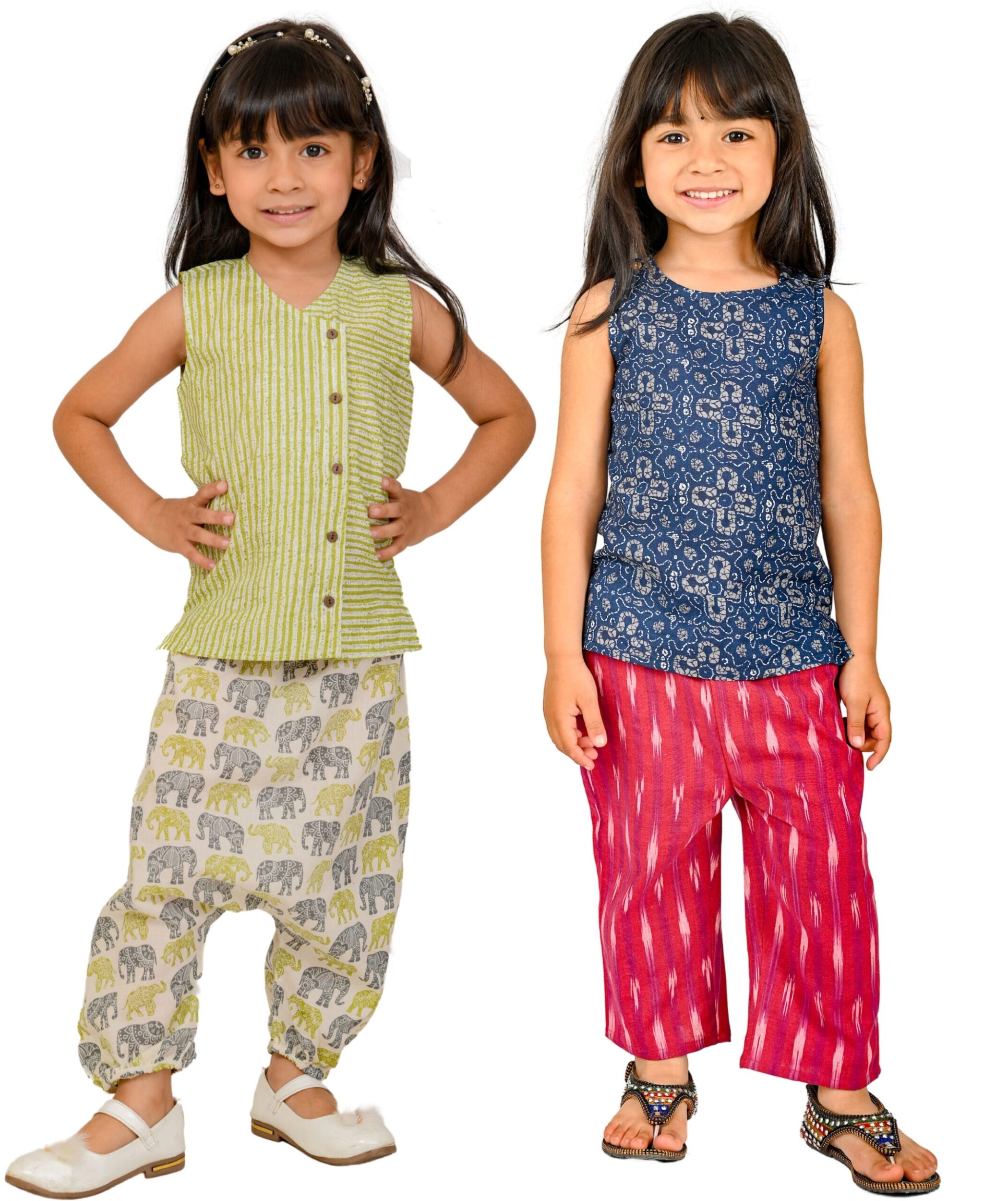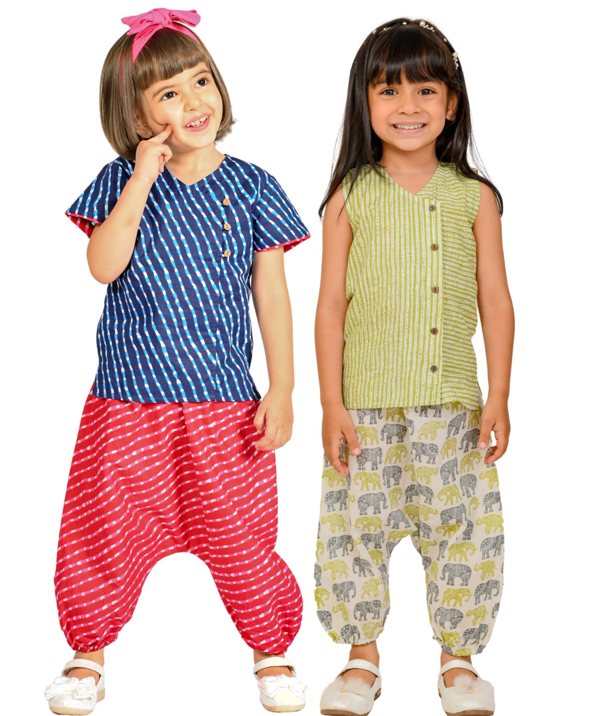 Kids Girls Dress Cotton Top Bottom Set – White:Green & Blue:Pink