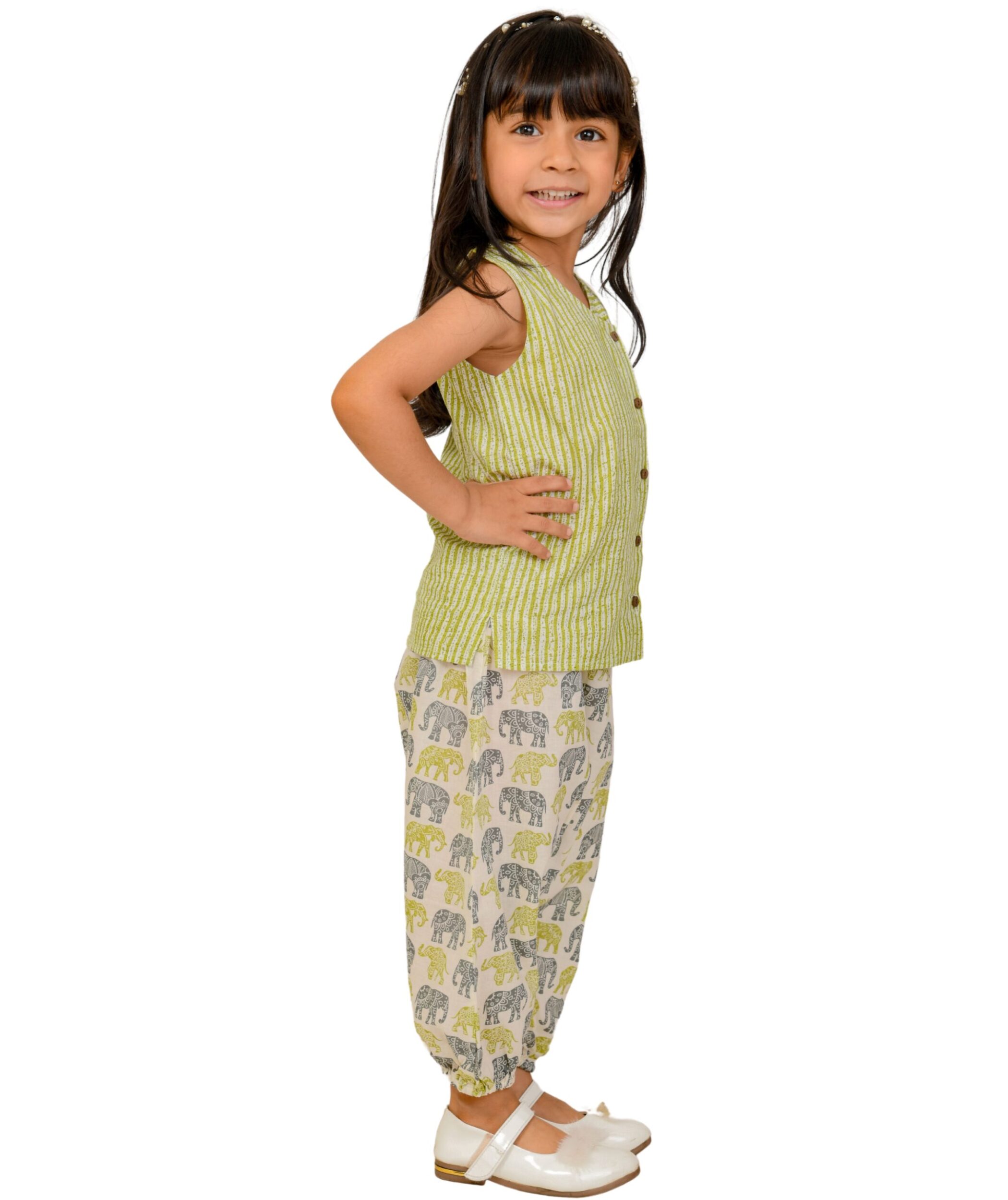 Kids Girl Dress Summer Cotton Top Pant Clothing – White:Green