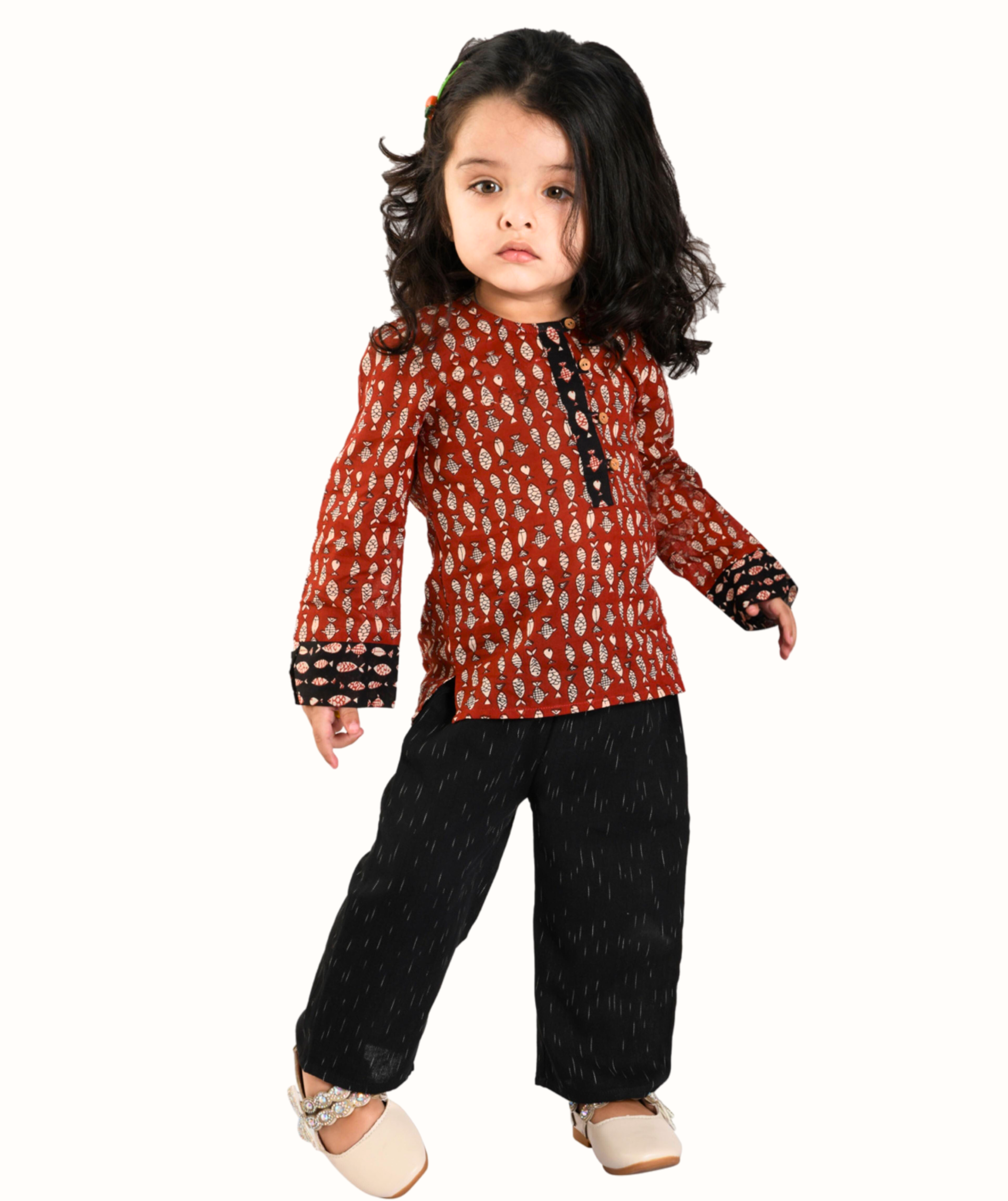 Kids Girl Full Sleeves Cotton Clothes Top Bottom – Black:Orange