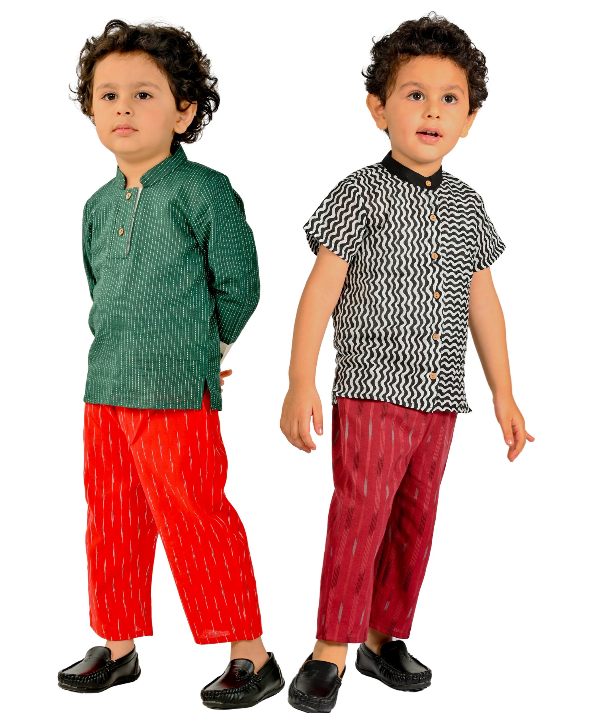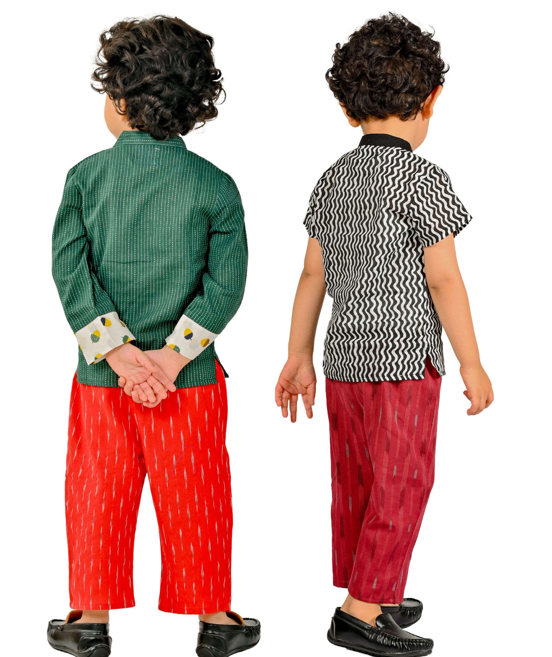 - Green-Red : Comfortable, soft and lightweight, this cotton clothing set is a must-have in baby kids’ wardrobe. The green kantha cotton kurta shirt features a collar, long sleeves with printed cuff & front button opening with printed inside finish. It comes along with a red woven ikat cotton pant which is elasticated at the waist.
