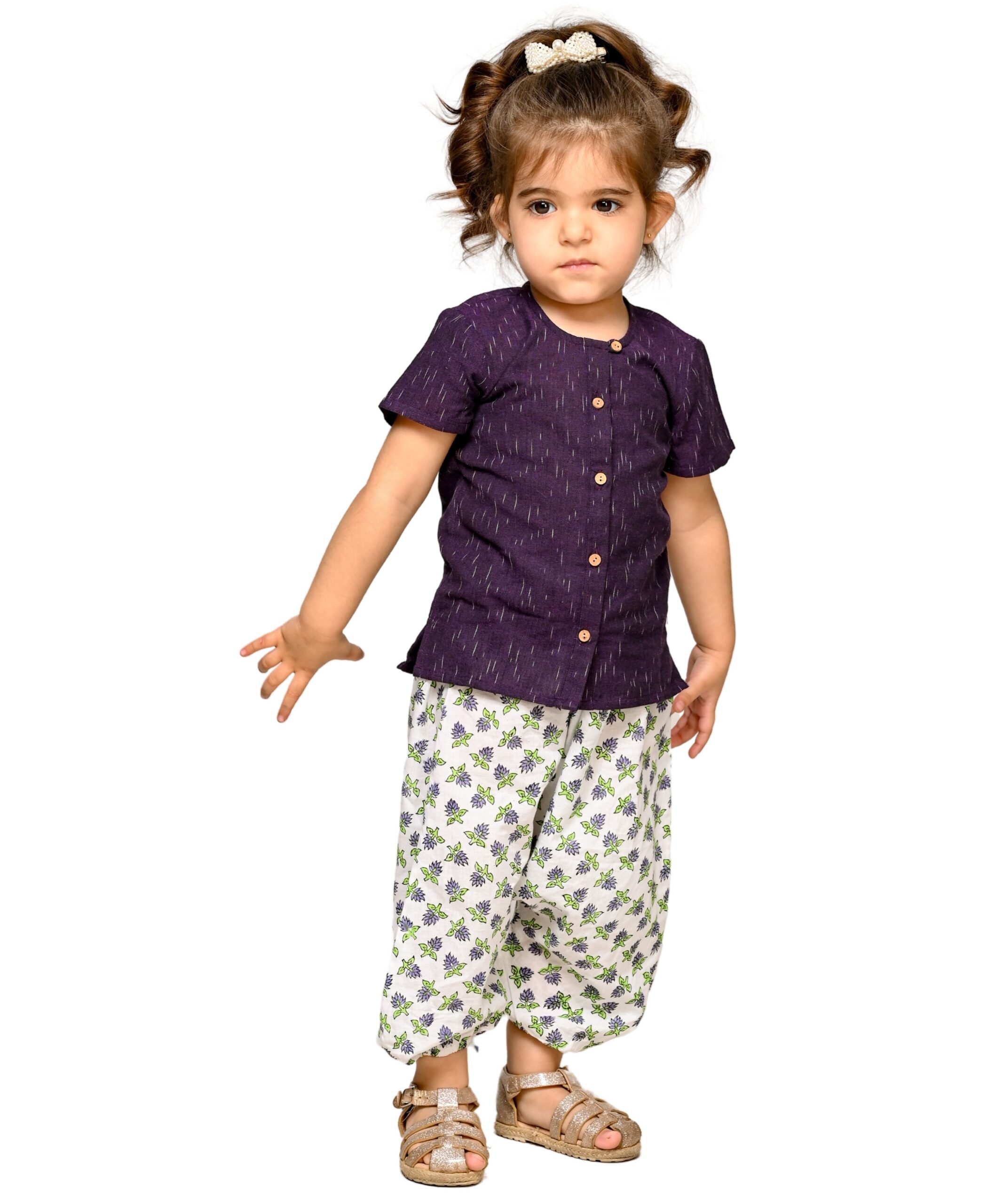 - Purple-White : Outfits that will keep your little ones happy always no matter where they go! Crafted in woven ikat cotton fabric, the purple top features a round neckline, short sleeves & front button opening The leaf handblock printed cotton pants is elasticated at the waist and ankle for comfort and ease.