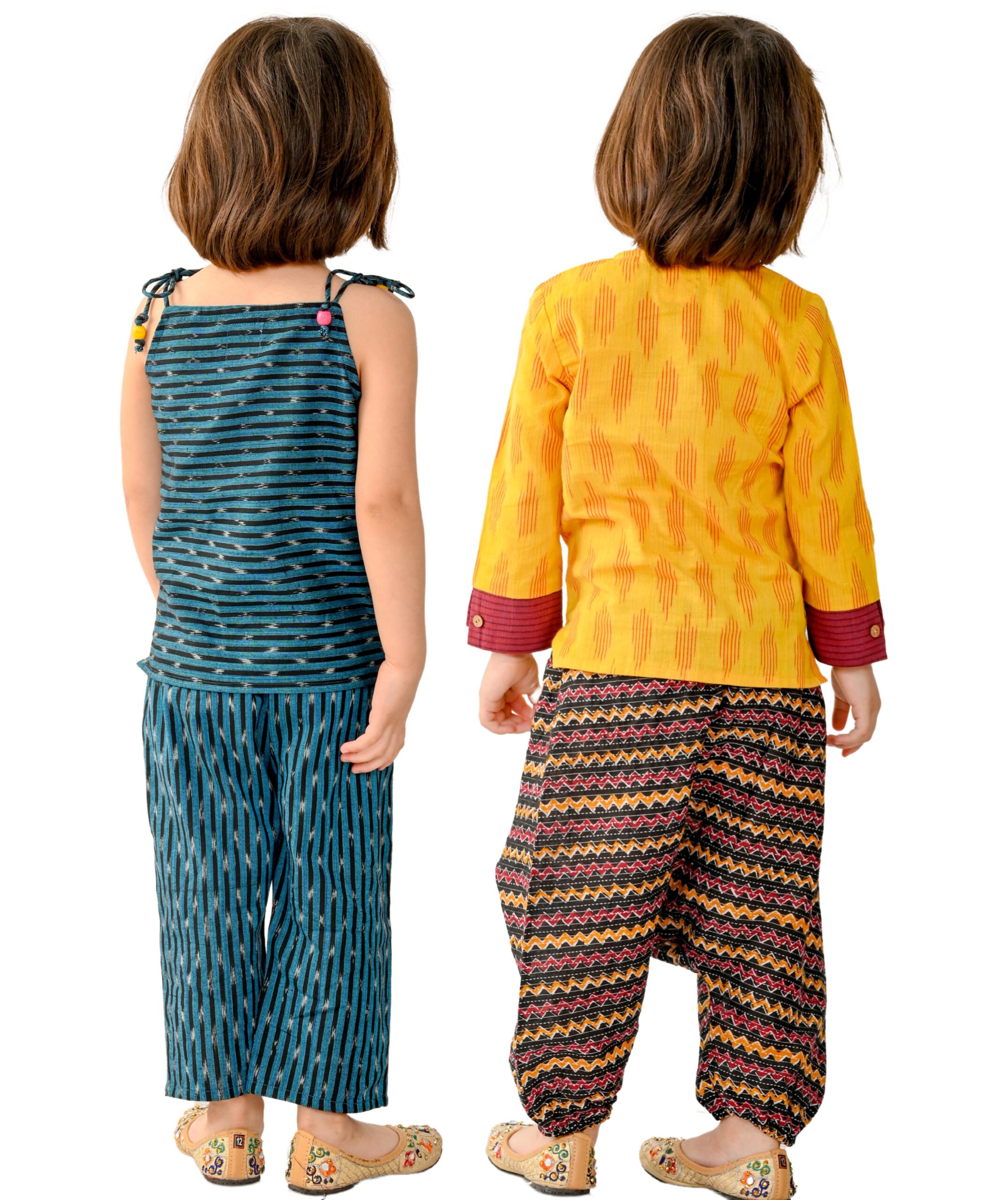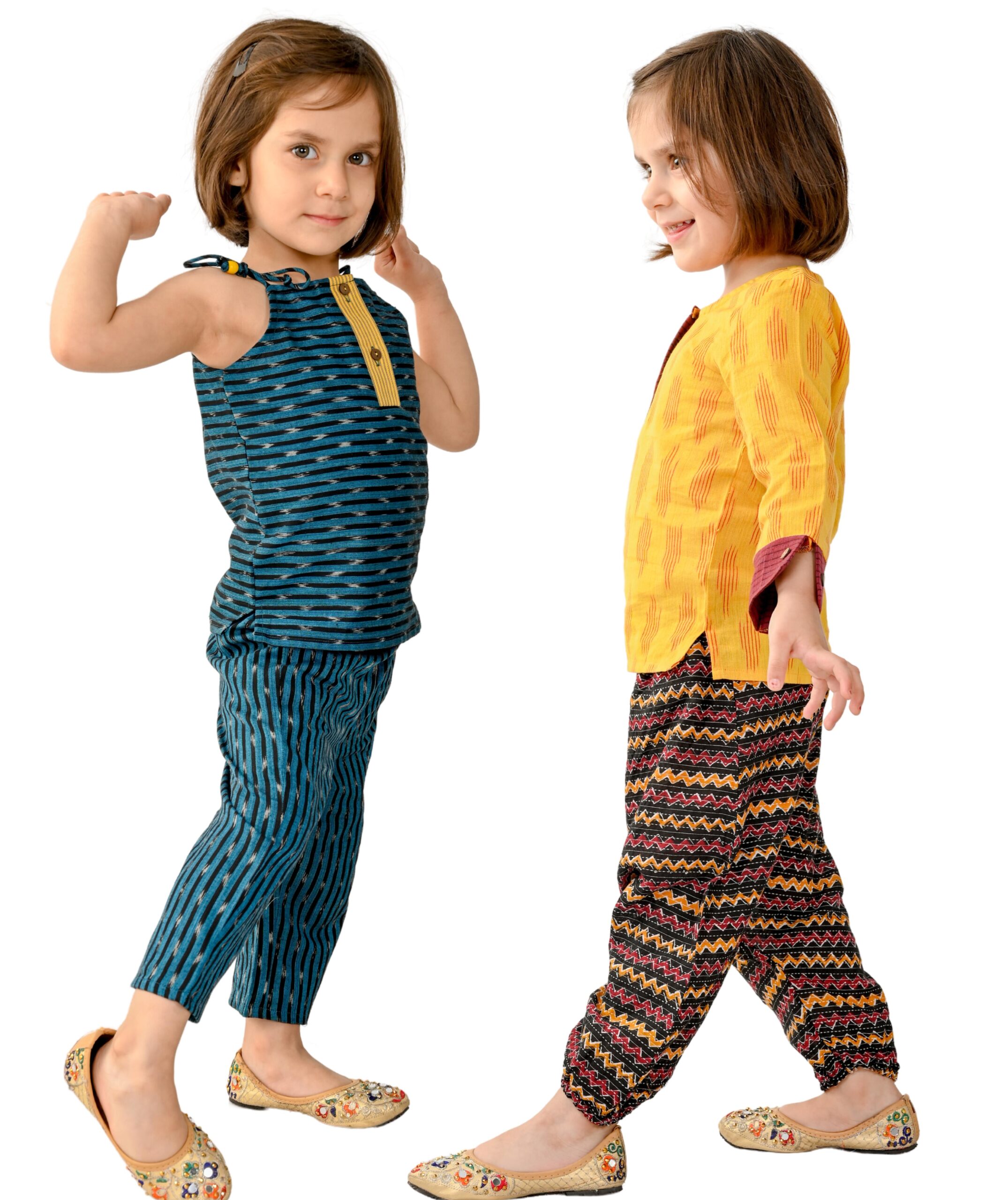 - Blue : Happy & Cheerful designs for your little ones to stay in comfort all day. The blue co-ord set comprises of a blue black woven ikat cotton top that features shoulder tie, is sleeveless and has front button opening. It is co-ordinated with ikat cotton pant that is elasticated at the waist.